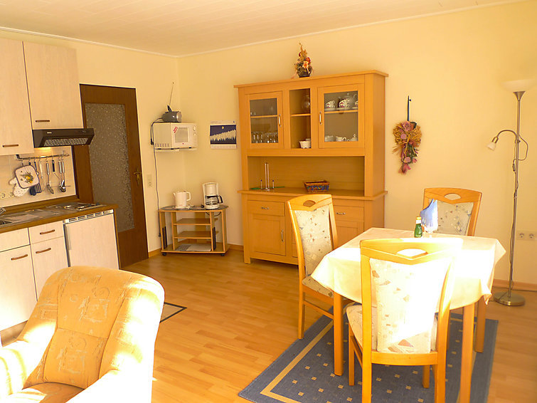 Appartement 2-kamers 40 m2, op de begane grond. Woon-/eetkamer 19 m2 met Kabel-TV (Flatscreen TV), radio. 1 kamer 13 m2 met 1 2-pers bed (2 x 90 cm, lengte 200 cm). Kookhoek (2-pits kookplaat, broodrooster, waterkoker, magnetron, elektrische koffiemachine). Douche/WC. Terras 14 m2. Terrasmeubelen. Ter beschikking: kinderstoel (extra). Internet (Internet (WiFi), gratis). Niet rokers woning.