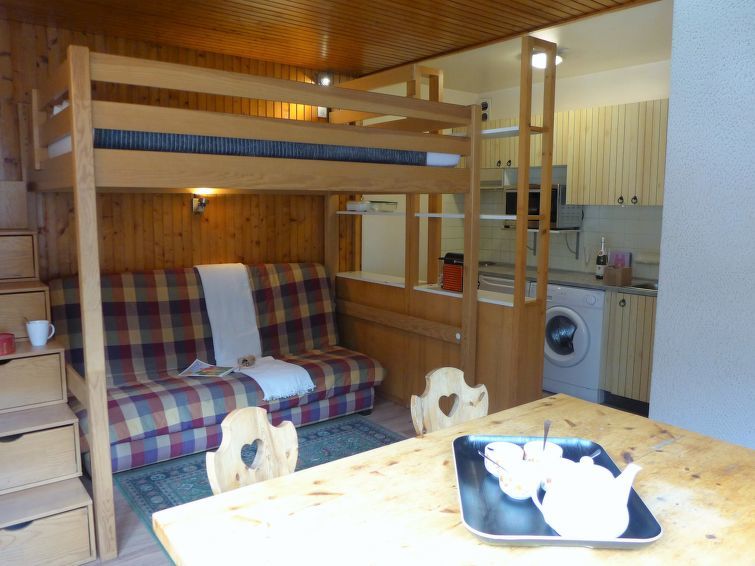 Studio 1-kamer 25 m2 op de 2e verdieping, op het zuidwesten gelegen. Rustiek ingericht: woon-/eetkamer met 1 2-pers divanbed (140 cm, lengte 190 cm), 1 2-pers bed (140 cm, lengte 190 cm), TV. Kookhoek (2-pits kookplaat, mini-oven, waterkoker, elektrische koffiemachine, pads voor de koffiemachine (Nespresso) extra). Bad/WC. Mooi uitzicht op de bergen. Ter beschikking: wasmachine. Internet (WiFi, extra). Parkeerplaats nr. 35 et cave n°21. TV alleen FR. Rookmelders. 74056003304UX