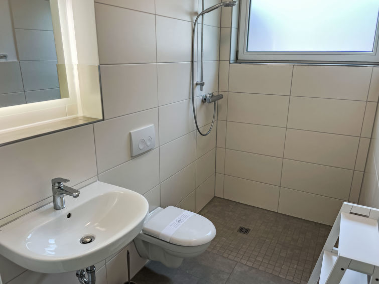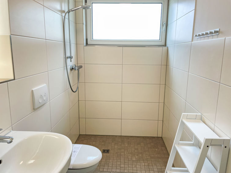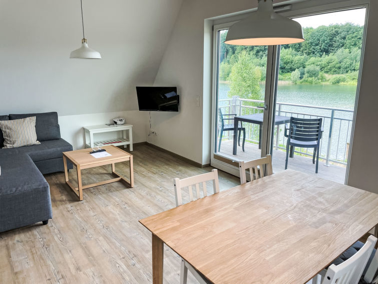 Appartement 3-kamers 58 m2, op de bovenverdieping. Comfortabel en modern ingericht: groot woon-/eetkamer met Sat-TV (Flatscreen TV). Uitgang naar het balkon. 1 kamer met 1 2-pers bed (180 cm, lengte 200 cm). 1 kamer met 2 bedden (90 cm, lengte 200 cm). Open keuken (oven, afwasmachine, 4 keramische glas kookplaten, broodrooster, waterkoker, elektrische koffiemachine). Douche/WC. Verwarming. Balkon. Balkonmeubilair. Zeer mooi uitzicht op het meer. Ter beschikking: kinderstoel. Internet (WiFi, gratis). Geschikt voor families. Maximaal 2 huisdieren/honden toegestaan.