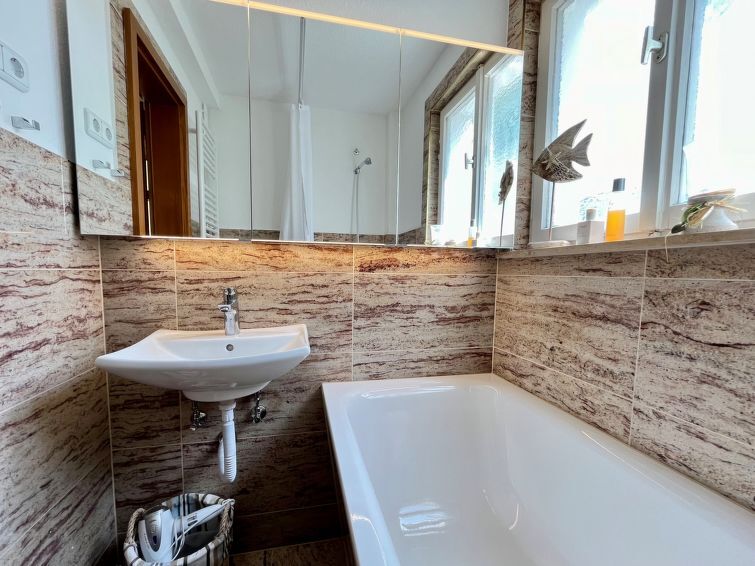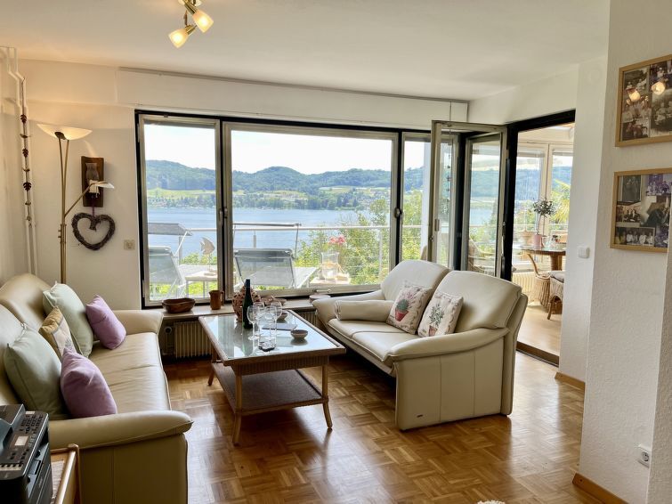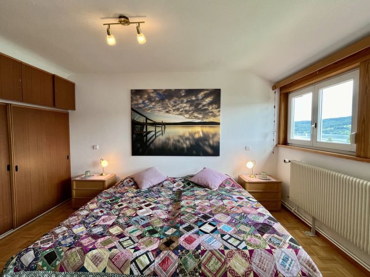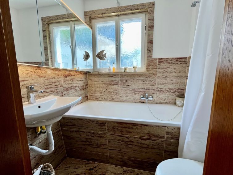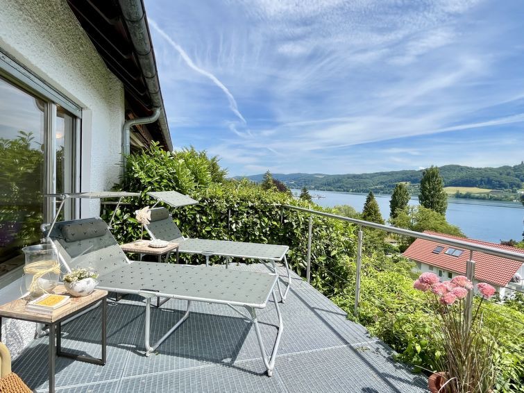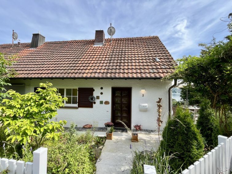 "Seepanorama", halfvrijstaand huis 4-kamers 90 m2 op 3 verdiepingen. Licht, gedeeltelijk gerenoveerd in 2022, mooi en gezellig ingericht: woonkamer met Sat-TV (Flatscreen TV), stereo-installatie. Doorgangskamer met eettafel. Uitgang naar het balkon, naar het terras. Open keuken (oven, afwasmachine, 4 keramische glas kookplaten, waterkoker, elektrische koffiemachine). Bad/WC. Verwarming. Souterrain: 1 2-pers. kamer met 1 2-pers bed (2 x 90 cm, lengte 200 cm). Doorgangskamer met 2 x 1 stapelbedden (90 cm, lengte 200 cm), wastafel. Bovenverdieping: 1 2-pers. kamer met 1 2-pers bed (180 cm, lengte 200 cm). Groot balkon, op het zuiden gelegen, groot terras, op het zuiden gelegen en op het westen gelegen. Terrasmeubelen, balkonmeubilair, elektrische barbecue (verrijdbaar), ligstoelen (2). Mooi uitzicht op het meer. Ter beschikking: wasmachine, droger, haardroger. Internet (WiFi, gratis). Parkeerplaats bij het huis. Niet geschikt voor kleine kinderen. Rookvrij huis. Rookmelders, brandblusser. Bedindeling is flexibel. Er zijn meer slaapmogelijkheden beschikbaar dan het maximaal toegestane aantal personen dat echter niet mag worden overschreden.