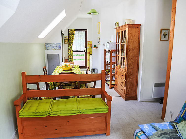 Appartement 2-kamers 38 m2 op de 1e verdieping. Doelmatig ingericht: woon-/eetkamer, met afgeschuinde daken met TV. 1 kamer met afgeschuinde daken met 1 2-pers bed (140 cm, lengte 190 cm). Slaapnis met 1 x 2 stapelbedden (90 cm, lengte 190 cm). Kookhoek in de hal (2-pits kookplaat, mini-oven, magnetron). Bad/WC. Elektrische verwarming. Ter beschikking: wasmachine. Rookmelders. Rookmelders. In plaats van een afgesloten slaapkamer bevinden sommige slaapgedeeltes zich in een open ruimte (galerij, nis, etc.).